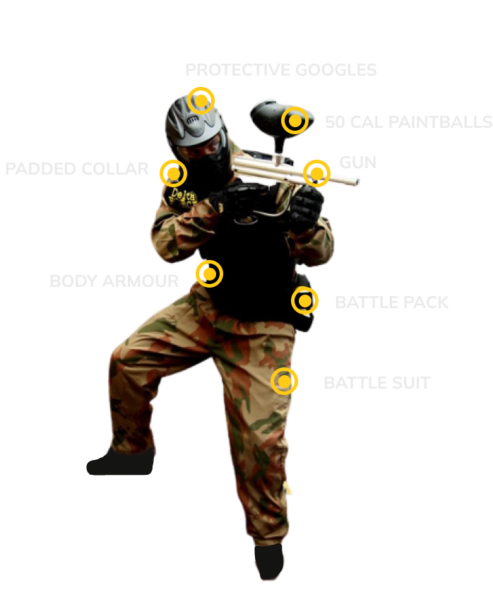 We issue all the best paintball equipment at the start of the day. A full SAS style overalls with a padded collar and full head protection goggles. We provide body armour, 200 round hopper, added battle-pack and Inferno paintball gun. All included in your entry and equipment price.